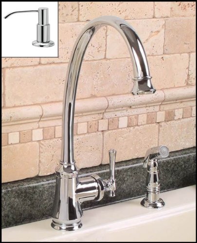 New Chrome single handle kitchen faucet and matching sprayer and soap pump. Traditional hi-rise style. From the Torino collection by Premier Faucet. Single Lever handled widespread. Three Hole Mounting. Hi-rise spout. Swivel Spout has approximately an 9" forward reach. 16 1/4" to top arch of spout. 11 1/2" to bottom of spout. Chrome finish. Quality Brass Construction. Ceramic Disc Cartridges. 1/2" IPS Connections. Provides 2.2 GPM at 60 PSI. Also included is a new Chrome soap or lotion dispenser. 13 oz. refillable plastic bottle. ADA Compliant. Limited Lifetime Warranty. Please contact if you have any questions or need the specifications sheet. More faucets in our storefront.
