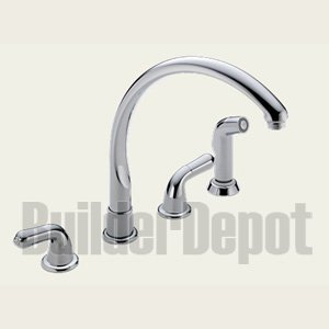 Delta 2276-LHP Waterfall Two Handle Kitchen Faucet, ChromeDelta 2276-LHP Two Handle Kitchen Faucet Features and Benefits:; Dramatic design with an elegant high-arc spout. ; Ergonomic design with distinctive look combines form and function. ; 9-1/2" long spout swings 360; for added convenience ; Scalloped handle bases enhance product style ; Matching vegetable sprayer for added functionality ; Matching bar/prep sink faucet for coordinated kitchen ; Lifetime Faucet and Finish Warranty 4-Hole 6-16" (Widespread) Delta 2276-LHP Waterfall Two Handle Kitchen Faucet Features:; 4 Hole Installation. ; 6" to 16" center widespread. ; 9 1/2" Long, 10 3/4" High spout swings 360 degrees. ; 1/4 turn handle stops. ; 1/2" IPS shanks. ; 2.2 gpm @ 60 psi, 8.3 L/min @ 414 kPa. ; With matching side spray that mounts on right or left. ; Pictured with H24 handles & A24 accents; Less Handles.* Handles not included, LHP is Less Handles Program