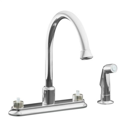 Kohler K-15889-K-CP Coralais Decorator kitchen sink faucet with 9" traditional spout and sidespray, requires handles, Polished ChromeOffering convenience, quality and style at a competitive price, this Coralais decorator kitchen sink faucet brings sleek design continuity to the kitchen and features a 9" traditional spout and sidespray. Choose from four handle styles to complete the look.Kohler K-15889-K-CP Coralais Decorator kitchen sink faucet with 9" traditional spout and sidespray, requires handles Features:; Choose from lever, cross, stacked or Euro handle styles; One-piece ceramic valve resists debris and hard water buildup; Ergonomic handle rotation provides on/off water control with only a quarter turn; For installation on 8" centers; All-metal construction ensures durability and long life