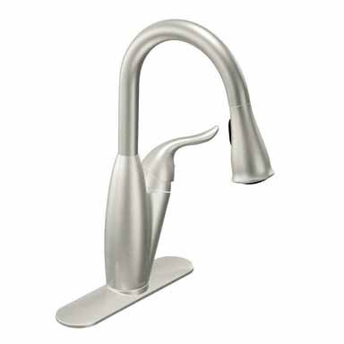Sold as each. 68" pull down spout. 1 lever handle. Lifeshine classic stainless finish. 1 or 3 hole installation. Hydrolock quick connect for easy installation. Three function spout has powerful spray, pause and aerated stream. Pause button temporarily stops the flow of water. Adds reach and convenience. Lifetime limited faucet warranty. Manufacturer's number: 87559CSL. Country of origin: United States. Distributed by Moen, Incorporated.