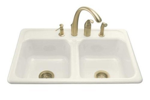 Kohler K-5817-3-96 Delafield self-rimming kitchen sink with three-hole faucet drilling, BiscuitThe Delafield kitchen sink offers exceptional quality and KOHLER; Cast Iron durability in a conventional designThe sink has double equal basins of 8" depth and three-hole faucet drilling, and is intended for self-rimming installations of at least 33"Kohler K-5817-3-96 Delafield self-rimming kitchen sink with three-hole faucet drilling, Biscuit Features:; 33"L x 22"H; Basin depth: 8"; Three-hole faucet drilling