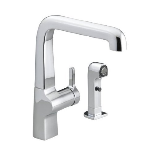 Kohler K-6334-SN Evoke single control kitchen sink faucet with sidespray, Vibrant Polished Nickel today's kitchens, creating a sense of charm and warmth so often lost in contemporary design. The single control design of Evoke remains intuitive to use and minimal in its form, creating a clean, uncluttered aesthetic. Evoke features an innovative two function sidespray with spray and laminar flow output for a level of performance previously only available with a pullout or pulldown faucet. Available in two spout sizes for primary and secondary sink applications.Kohler K-6334-SN Evoke single control kitchen sink faucet with sidespray, Vibrant Polished Nickel Features:; Streamline contemporary aesthetics creates a distinctive statement and makes clean-up and maintenance simple and quick.; Spout rotates 360 degrees with 10" clearance below the spout for maximum versatility and use with large pots and pans; Unique design coordinated two function sidespray provides both spray and laminar flow output for both cleaning and filling activities both inside and outside the sink work area.; Sidespray features ProMotion technology with non-metallic hose and ball joint for quiet, light and easy to use operation.; MasterClean?รครณ sprayface reduces mineral buildup and makes it simpler to clean and maintain; Coordinating secondary sink faucet provides aesthetic coordination in multiple sink applications; ADA compliant lever handle for ease of operation; Utilizes Kohler installation ring and flexible inlet connections for ease of installation; KOHLER finishes resist corrosion and tarnishing, exceeding industry durability standards over two times; Kohler ceramic disk valves exceed industry longevity standards by over two times, ensuring durable performance for life