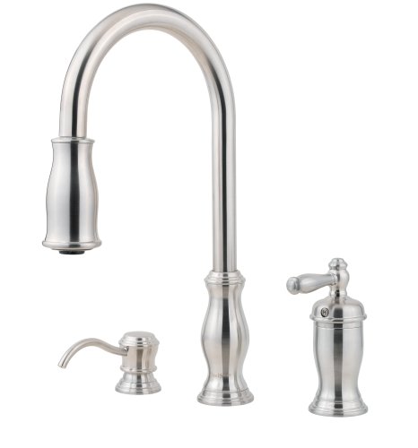 This Price Pfister Hannover Series faucet will be the center point of your new kitchen makeover. It features a combination of beauty and function, from the high arc to the pull-out, 2 mode sprayer. It's complimented with a matching soap dispenser.