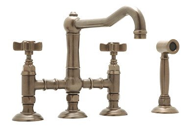 Rohl Bridge Kitchen Faucet 3 Leg Bridge Country Kitchen Faucet With Side Spray In Polished Nickel Finish A1458LMWSPN. Features: Metal Lever Handles (not cross handles as shown). 1/4-turn ceramic valves. 8 55/64" reach swivel spout. 9 1/4" high column spout. 1/2" M supplies, 2.5 GPM. 4 holes required. Max depth of deck is 2 1/8". Insulated brass side spray with serviceable cartridge for easy maintenance. Brand new factory sealed with full manufacturer's warranty. In Stock Ready to Ship Today. THE PICTURE MAY NOT REPRESENT THE ACTUAL FINISH. Authentically Crafted in Piedmonte, Italy